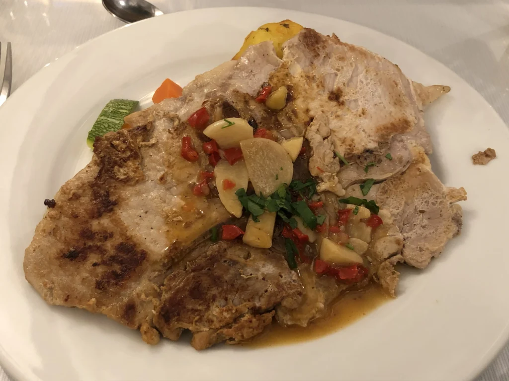他にも、大量の野菜が盛り合わせになった前菜や別のポークソテー、バニラアイスやレモンチーズケーキなどがありました。